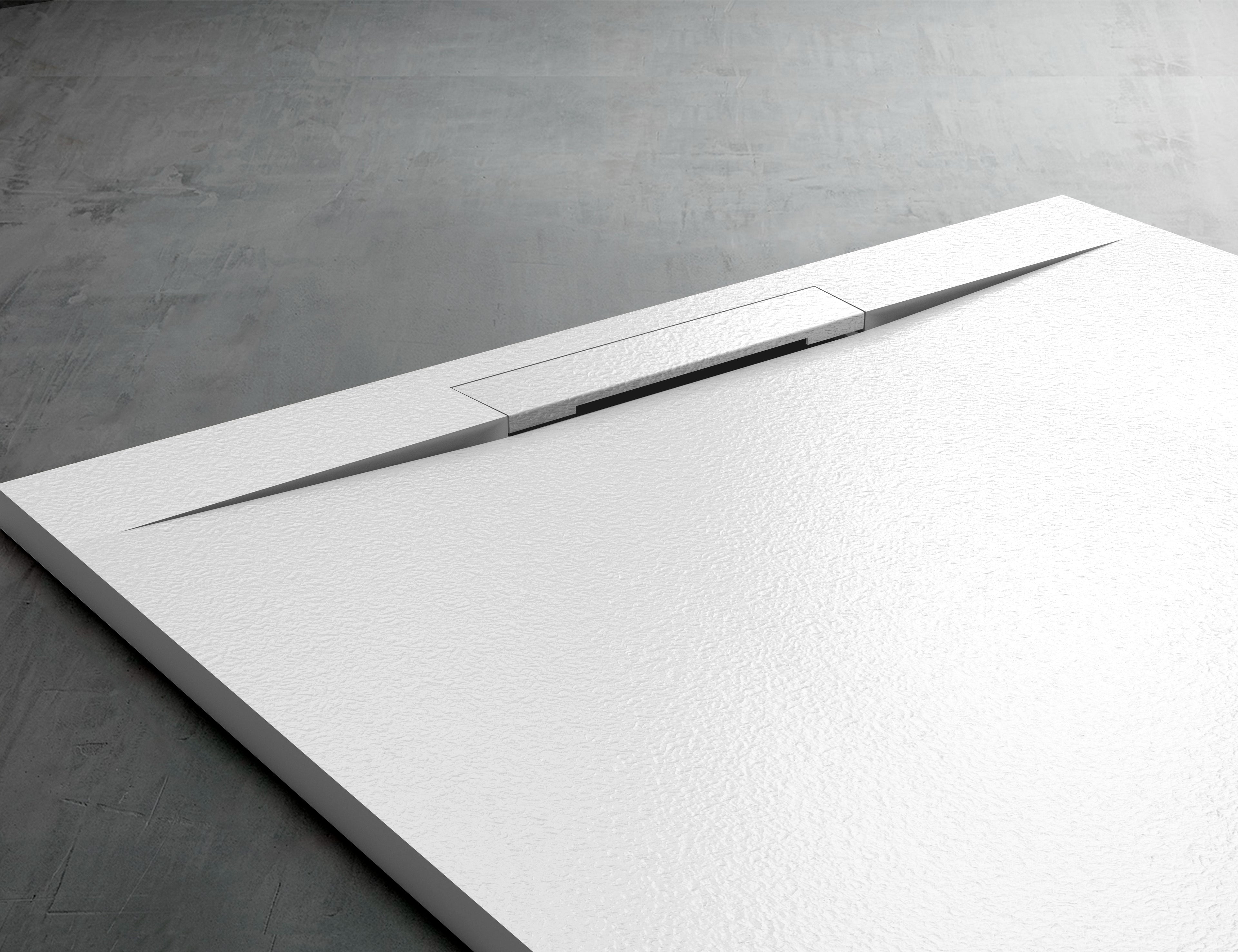 Plato de ducha GANDÍA PLUS blanco con rejilla lineal de acero inoxidable con recubrimiento de gel coat texturizado, pintada del mismo color que el plato. ( incluída )